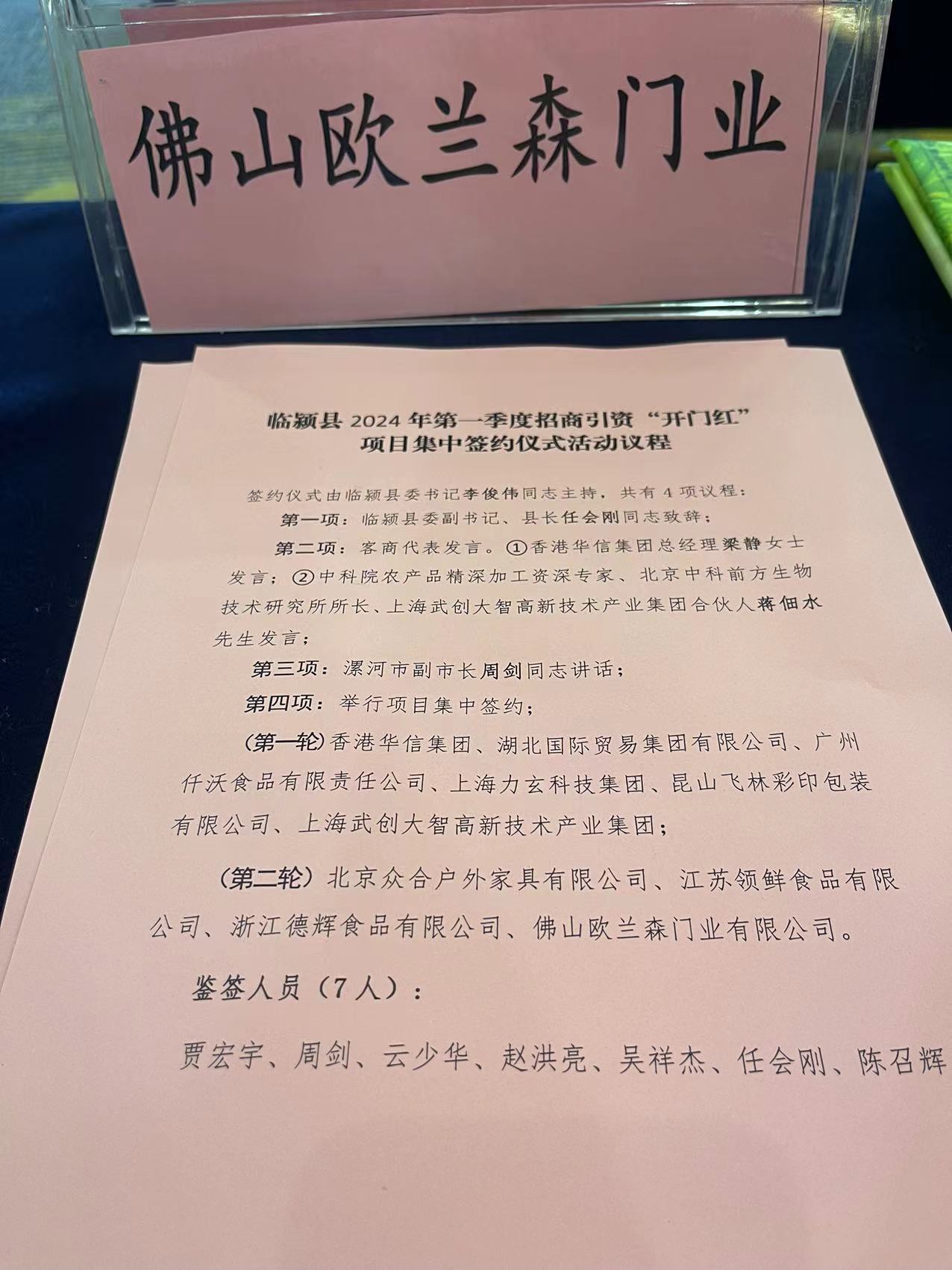 2月25日,临颍县举行2024年第一季度招商引资“开门红”项目集中签约仪式,市委副书记贾宏宇、市政府副市长周剑,县领导李俊伟、任会刚、陈召辉、李磊、王志敏、于胜洋及香港华信集团、上海武创大智高新产业技术集团、上海力玄科技、江苏领鲜食品等10家企业负责人,市直、县直及项目服务单位负责人参加签约仪式。